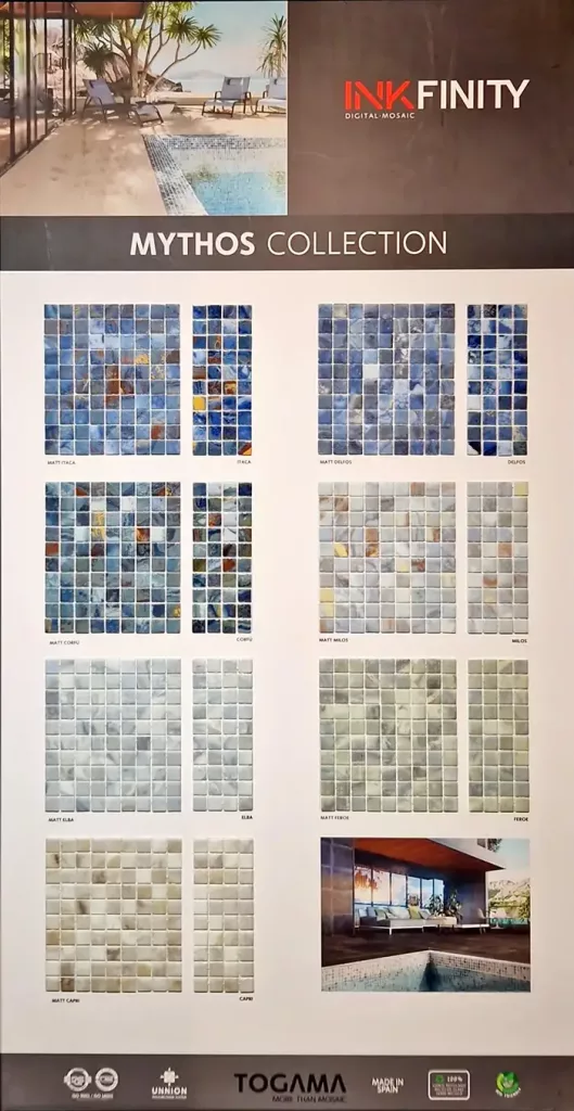 La serie Mythos de Togama es una colección de mosaico vítreo de alta gama que utiliza la tecnología Inkfinity (impresión digital) para recrear con una precisión asombrosa las texturas de las piedras naturales y paisajes mediterráneos. Fabricada con vidrio 100% reciclado, esta serie se presenta en placas de 33,4×33,4 cm con teselas de 2,5×2,5 cm. Destaca por su alta destonificación y modelos como Itaca, Milos, Delfos o Feroe, que ofrecen mezclas de tonos tierra, azules y verdes. Gracias al sistema de pegado UNNION (punto de poliuretano), garantiza una colocación perfecta y una durabilidad extrema en piscinas, spas y zonas wellness que buscan un efecto de agua natural, profundo y sofisticado.