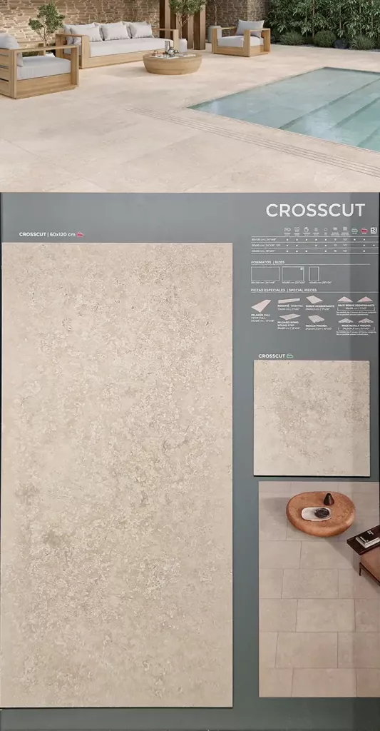 Crosscut de Mykonos Cerámica nace de la inspiración en la piedra natural, ofreciendo gres porcelánico de gran riqueza visual en formatos rectangulares como 60×120 cm, 60×90 cm y 40×60 cm, con acabados rectificados y versiones antideslizantes aptas para suelos y paredes tanto en interiores como exteriores. Su tono Sand cálido y la textura natural lo hacen ideal para proyectos que buscan continuidad, elegancia y resistencia (incluyendo zonas de piscina o terrazas), aportando un estilo mediterráneo sobrio y actual.