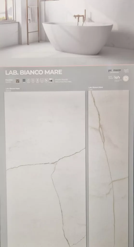 es una colección de gres porcelánico inspirada en el mármol más puro, con formatos grandes como 120×120 cm, 90×90 cm y 60×120 cm, además de mosaicos y piezas complementarias. Su acabado mate rectificado tiene una estética limpia y suave al tacto, ideal para suelos y revestimientos interiores como baños, cocinas o salones, combinando elegancia, durabilidad y facilidad de mantenimiento