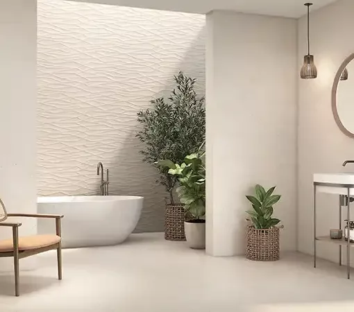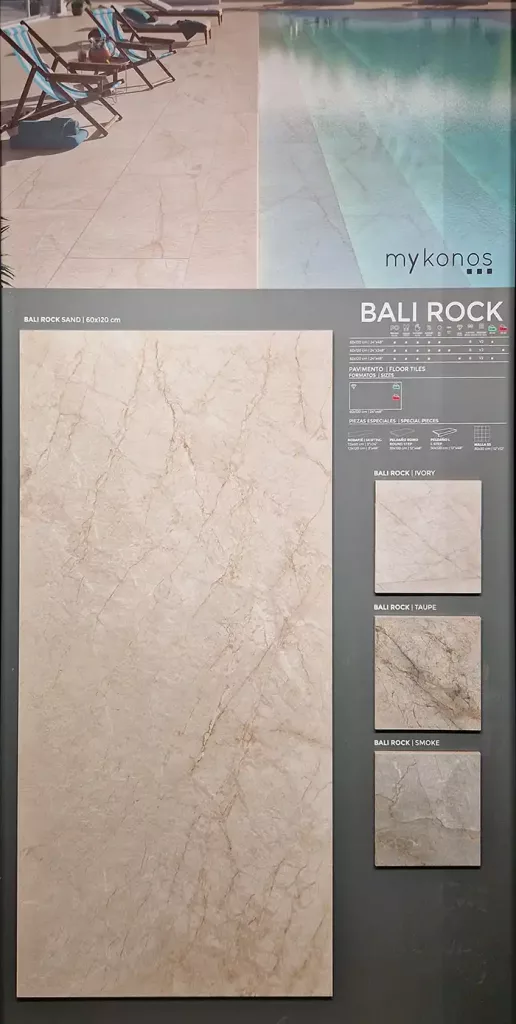 La colección Bali Rock de Mykonos Cerámica es gres porcelánico de efecto piedra con un formato 60 × 120 cm (también disponible en otros tamaños y versiones antideslizantes) y disponible en colores neutros como Ivory, Sand, Taupe, Smoke.