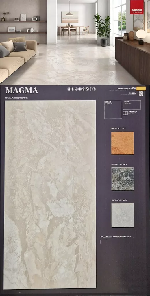 Magma colección de gres porcelánico de Pamesa que evoca la textura y riqueza de las piedras volcánicas y minerales, disponible en varios tonos (típicamente Chill, Cold, Warm, Hot) y formatos amplios como 60×120 cm y 120×120 cm, con acabado rectificado y superficie tipo antic que aporta carácter a suelos y paredes. Su estética combina robustez, calidez y un acabado contemporáneo ideal para espacios modernos.