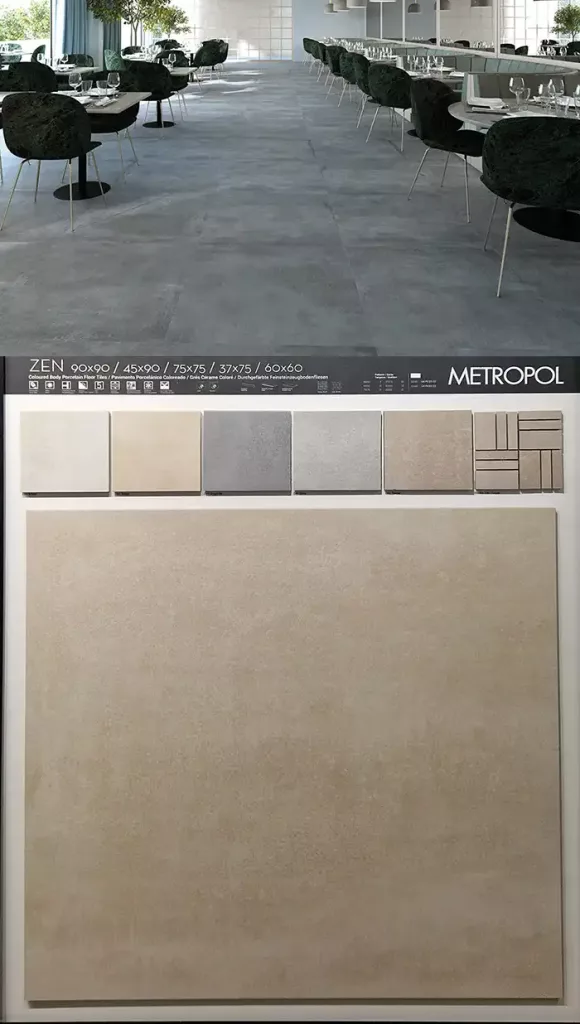 La colección Zen de Metropol ofrece gres porcelánico estilo cemento en tonos neutros y cálidos como blanco, beige, taupe, gris y grafito. Está disponible en múltiples formatos (por ejemplo 30×90 cm, 60×60 cm, 75×75 cm, 90×90 cm) con junta mínima gracias al rectificado. La estética aporta calma, limpieza y continuidad visual, perfecta para espacios dedicados a la belleza y el bienestar como salones de estética o cabinas.