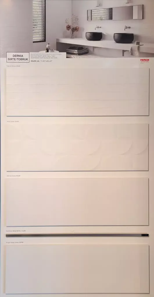 La colección Whites-Tripoli de Pamesa Cerámica incluye las series Dernia, Sirte y Tobruk, revestimientos cerámicos de pasta blanca rectificada en formato 30×90 cm. Con acabados mate y colores neutros como blanco y gris suave, estas series aportan elegancia y luminosidad a espacios interiores como baños y cocinas. Su diseño minimalista y versatilidad las convierten en una opción ideal para ambientes contemporáneos.