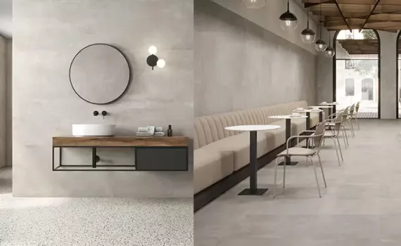 Se trata de un porcelánico que recrea con una fidelidad absoluta la superficie del cemento alisado o microcemento, eliminando cualquier distracción visual para centrarse en la pureza del material.