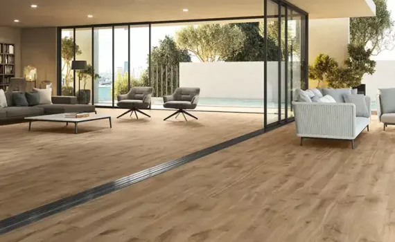 Es un gres porcelánico esmaltado que captura fielmente la calidez de la madera natural en un formato de 23x120 cm.