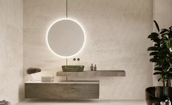 Es una colección de inspiración pétrea-cementosa que destaca por su equilibrio visual y su superficie rica en microdetalles.