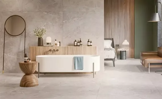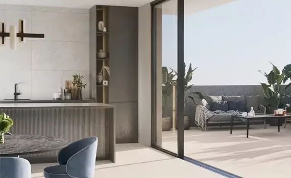Es un porcelánico de estética pétrea-cementosa que destaca por su elegancia discreta y su superficie rica en microtexturas.